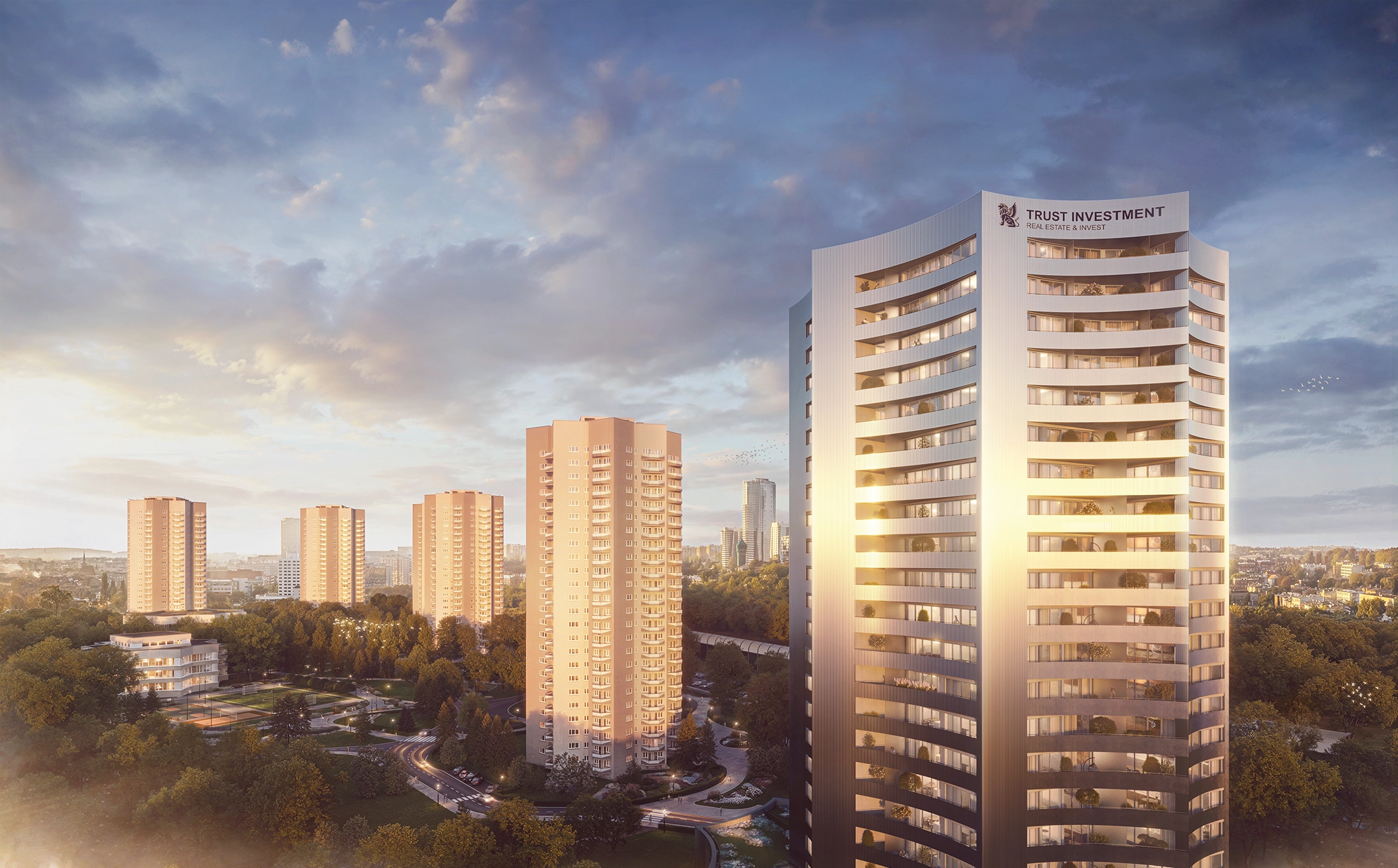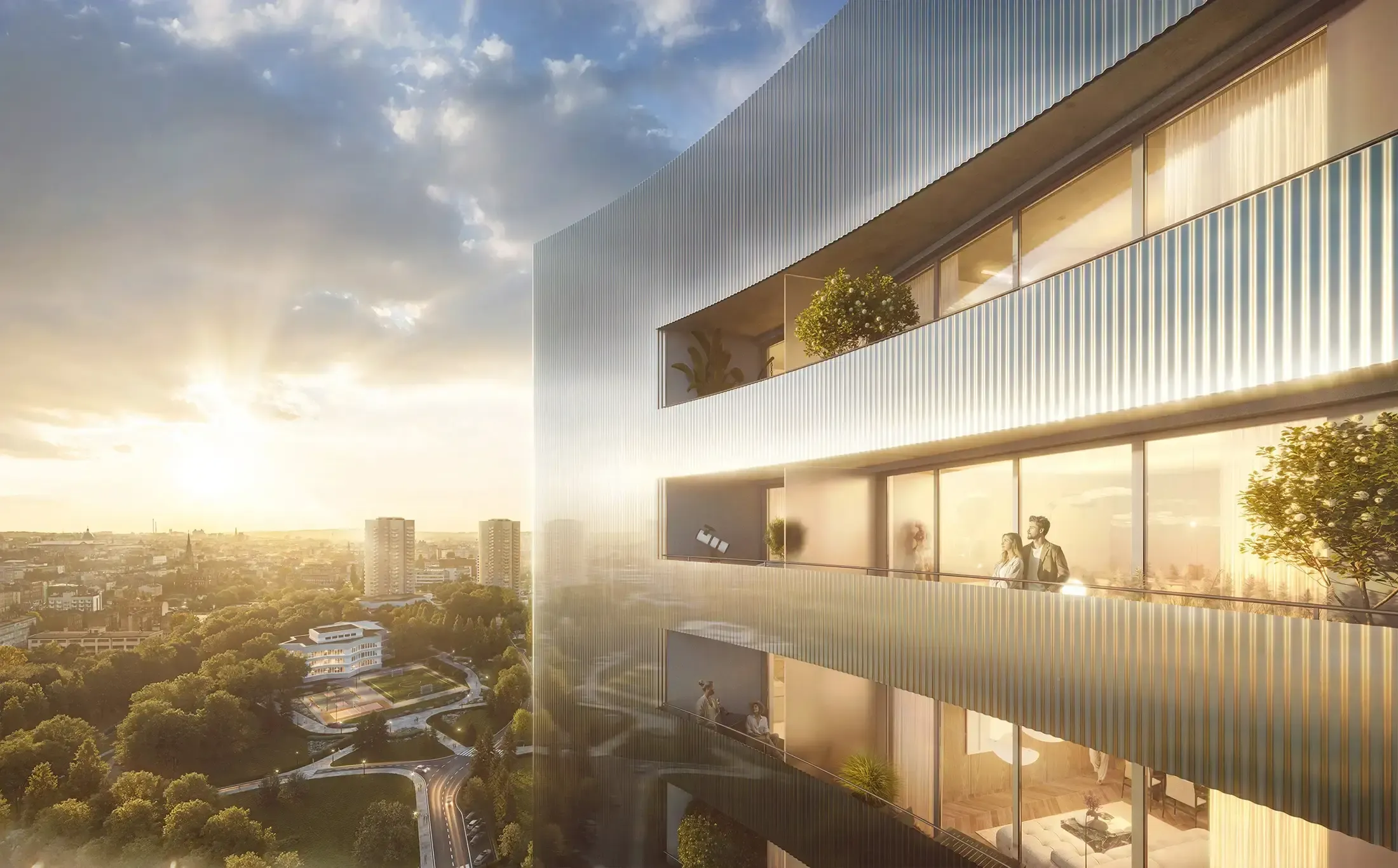 The architecture of this development captivates like a constellation of perfectly designed forms — full of harmony, light, and a futuristic glow. The façade is clad in corrugated polished metal, giving it a distinctive sense of rhythm, lightness, and a futuristic character. The lower part of the building corresponds with the existing “Stars.” This is where retail and service spaces are located, along with two residential levels. The development impresses with its form — eight soaring arms arranged in an arc give the structure dynamism and a unique architectural expression.