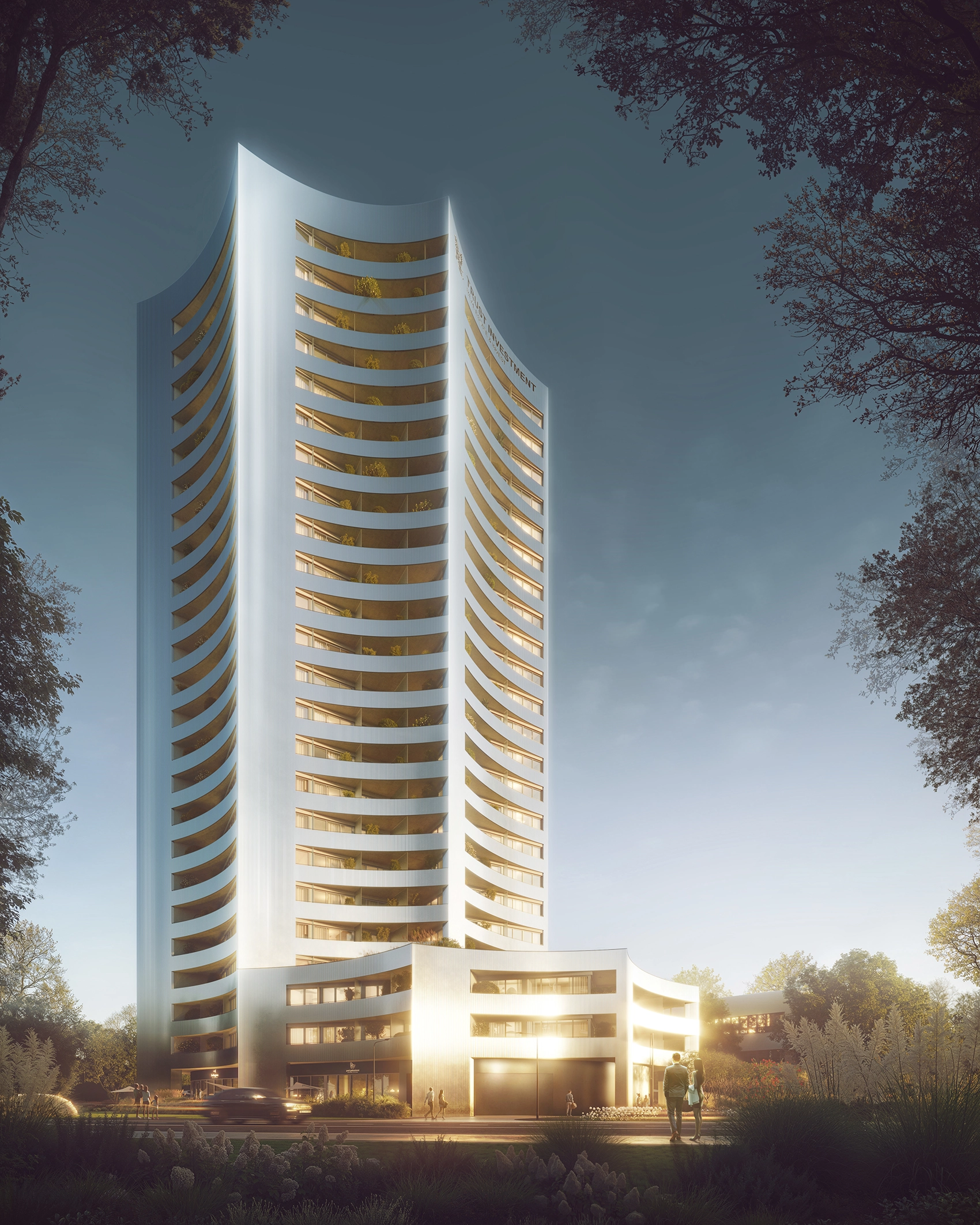 The architecture of this development captivates like a constellation of perfectly designed forms — full of harmony, light, and a futuristic glow. The façade is clad in corrugated polished metal, giving it a distinctive sense of rhythm, lightness, and a futuristic character. The lower part of the building corresponds with the existing “Stars.” This is where retail and service spaces are located, along with two residential levels. The development impresses with its form — eight soaring arms arranged in an arc give the structure dynamism and a unique architectural expression.